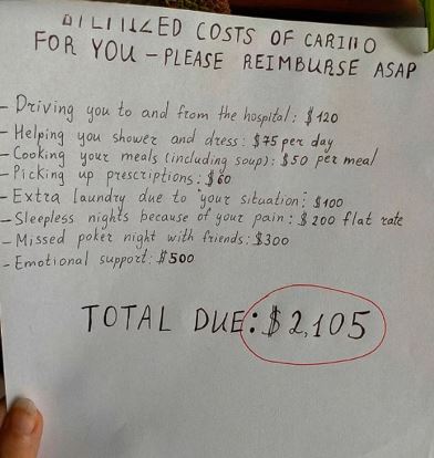 Three days after my hysterectomy, still sore and exhausted, I shuffled into the kitchen hoping for comfort. Instead, I found an invoice taped to the fridge. In Daniel’s neat accountant handwriting, it read: “Itemized Costs of Caring for You — Please Reimburse ASAP.” He had listed everything — driving me to the hospital, making meals, even “emotional support.” At the bottom: $2,105 due.