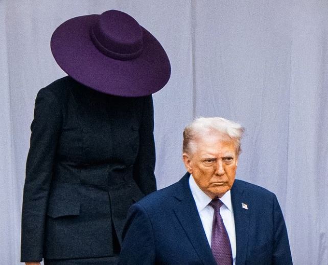 Melania wore a striking wide-brimmed purple Dior hat paired with a charcoal gray skirt suit. The look drew comparisons to the elegant styles of Princess Diana and Princess Catherine. Many viewers noted how the hat matched President Trump’s purple tie, a detail some interpreted as a subtle show of unity.Social media buzzed with reactions. Some praised the stylish coordination, while others questioned the practicality of such a large hat since it partially covered her face.
