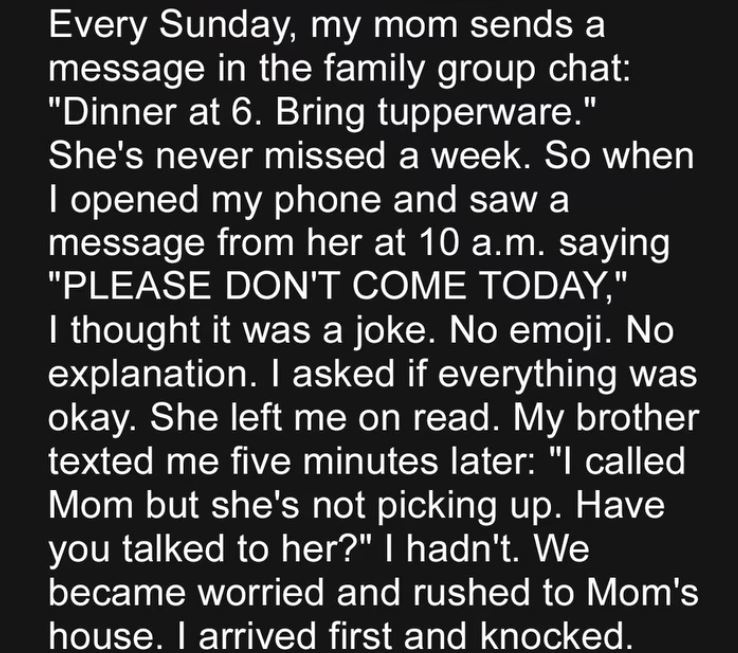 That night, we stayed with her. There was no roast chicken or carefully set table — just pizza boxes, mugs of tea, and a long conversation that helped us all begin to heal. Before bed, Mom sent a new message to the family group chat: “Dinner next Sunday. 6 p.m. Bring tupperware. And maybe a hug.” It reminded us that no secret, no mistake, could erase the love and traditions we had built together.