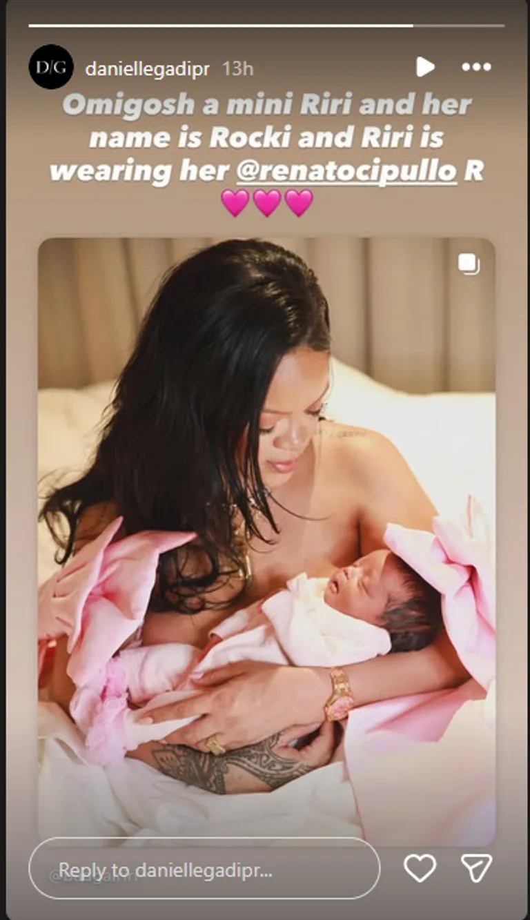 The first glimpse of Rocki sent social media into overdrive. Admirers praised her unique name and resemblance to her famous mom. Comments poured in: “Welcome baby Rocki!” and “Little Riri is finally here .” Rihanna’s post also showcased her style. She wore a watch, a ring, and a Renato Cipullo Splendente Letter Pendant necklace in yellow gold, valued at $7,950, which fans and jewelers quickly highlighted online.