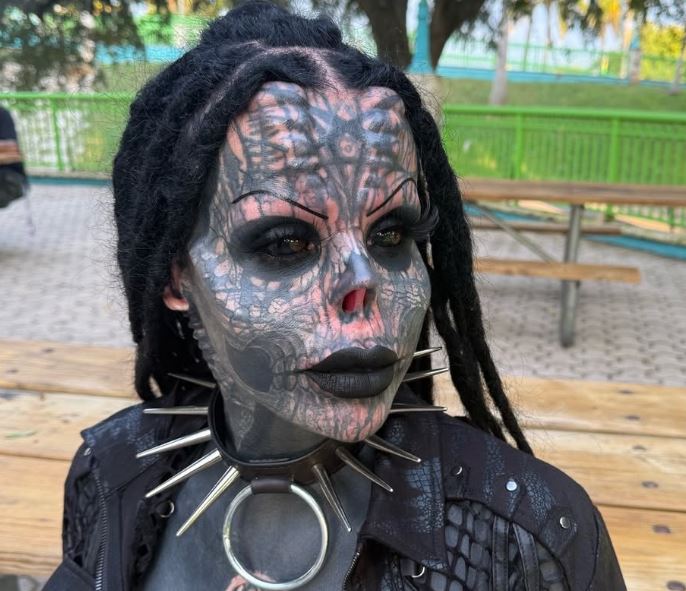 Social media users are stunned after a woman revealed a transformation so extreme it looks like a lifetime of change—yet it happened in just four years. Known online as Toxii, she proudly calls herself a body modification enthusiast. Today, her upper body is nearly blacked out in tattoos. She’s also had her nose removed, tattooed her eyes and tongue, split her tongue, and even implanted horns in her forehead. Most shockingly, she keeps her removed body parts preserved in small jars.