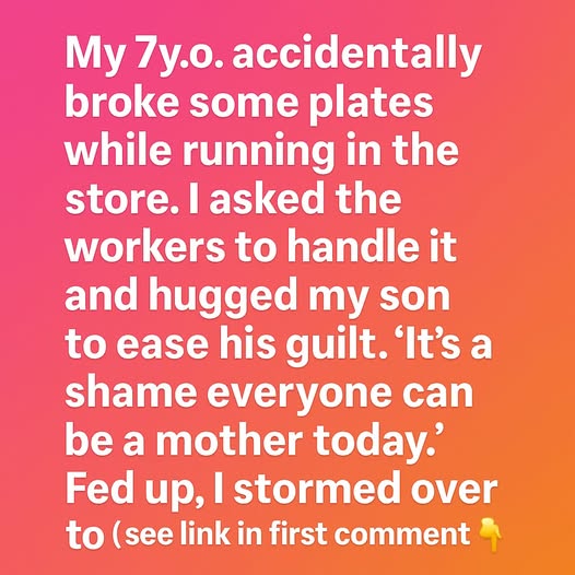 As I reassured him, a woman nearby shook her head and muttered, “It’s a shame anyone can be a mother nowadays.” Her words stung, not because I doubted myself, but because I knew she didn’t understand the moment. She saw broken plates; I saw a scared child who needed guidance, not shame. I held my son’s hand tighter and reminded him we’d fix the situation together. Compassion was more important than perfection.