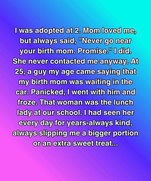 I was adopted at 2. Mom loved me, but always said, “Never go near your birth mom. Promise.” I did. She never contacted me anyway. At 25, a guy my age came saying that my birth mom was waiting in the car. Panicked, I went with him and froze. That woman was the lunch lady at our school. I had seen her every day for years—always kind, always slipping me a bigger portion or an extra sweet treat…