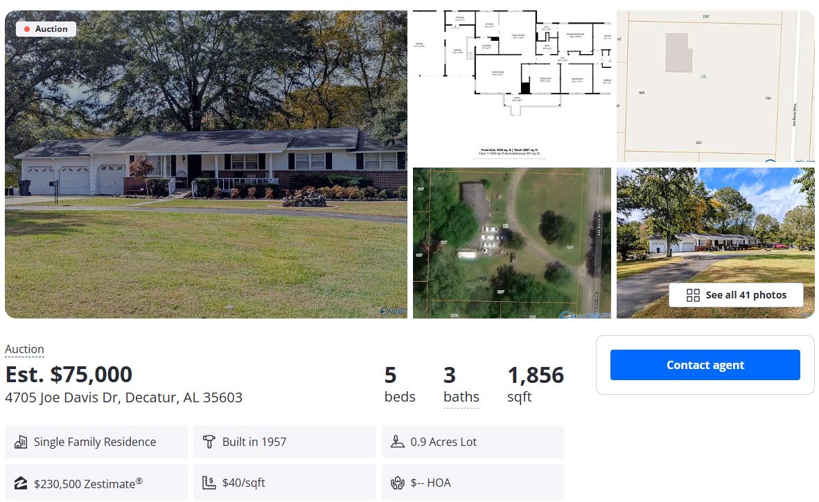The three-car attached garage has a paved driveway; the property is a one-story ranch style structure with potential for updating and customization as desired. It is located in the 35603 area of ​​Decatur, Alabama, on a parcel without a dedicated municipal association (HOA) and is awaiting renovations to be completed to fulfill the buyer’s vision.