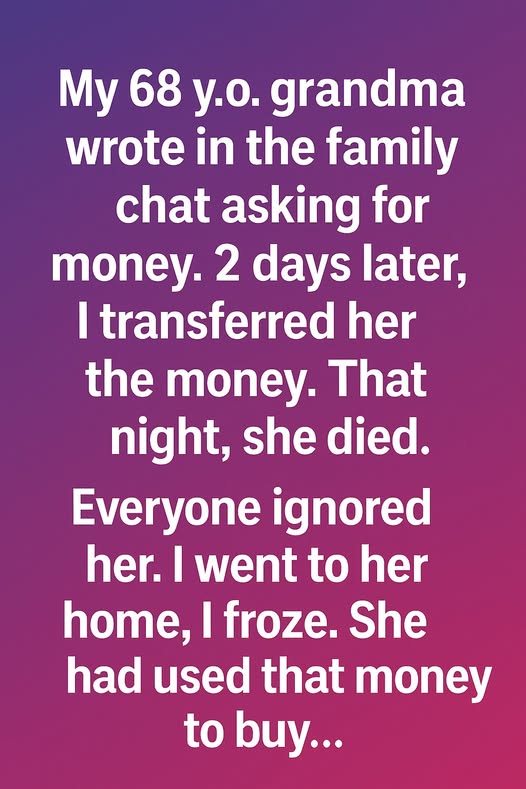 Some moments in life arrive quietly, almost unnoticed—until they become the ones you return to again and again. That’s what happened the day my 68-year-old grandmother wrote a short message in our family group chat. She asked if anyone could help her with a little money, nothing dramatic or urgent, just a simple request slipped between everyone’s busy schedules. Most relatives didn’t reply. They were working, driving, distracted… living life. But her message lingered in my mind longer than I expected. Two days later, I finally sent her the small amount she asked for, feeling relieved I could help. I had no idea it would be the last thing I ever did for her. That night, she passed away peacefully in her sleep — and her quiet request suddenly felt heavier than anything I could have imagined.
