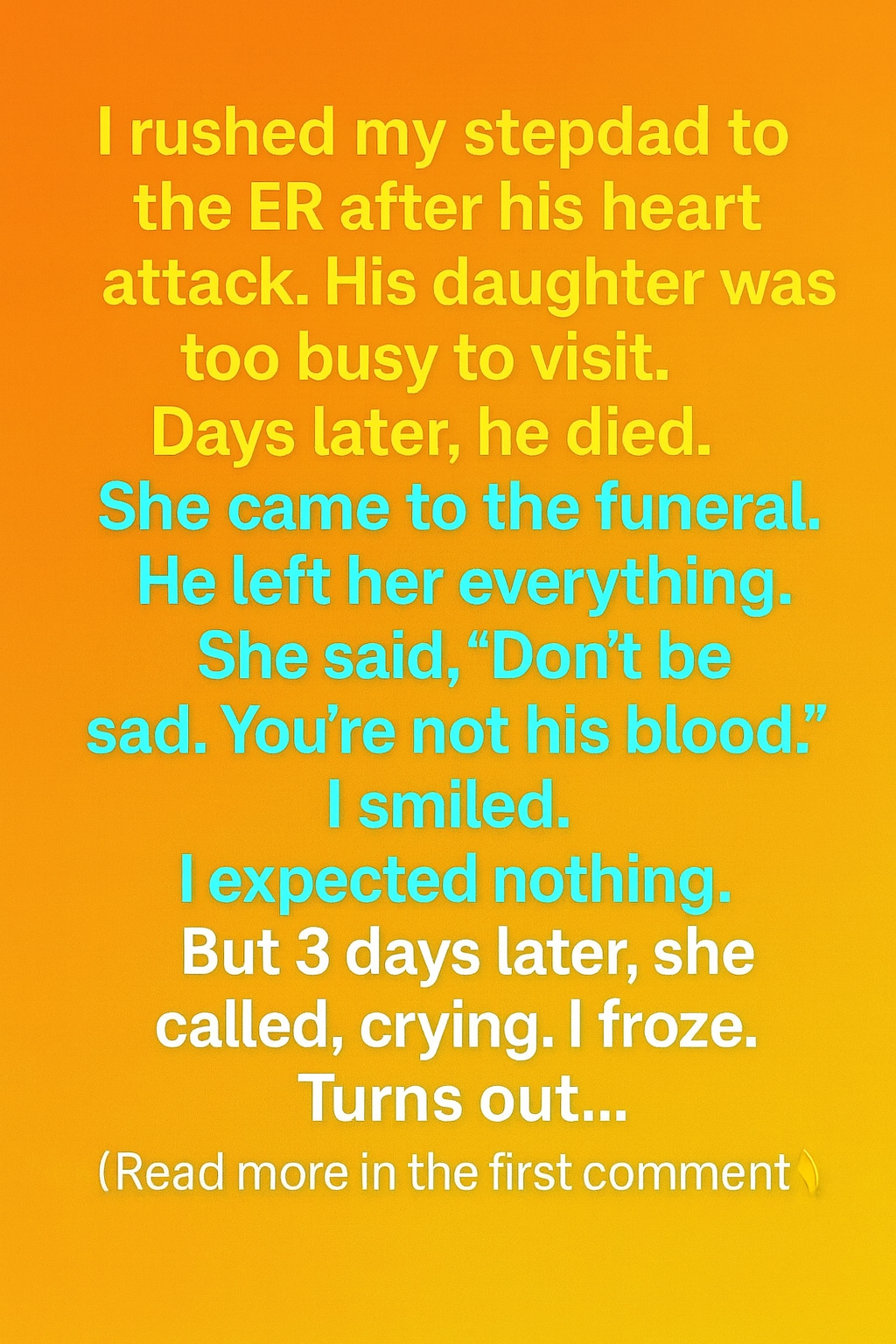 I drove my stepdad to the ER on a cold, heavy morning after he suffered a heart attack. He tried to insist he was “fine,” but I could see the fear beneath his jokes and sweat. I stayed by his side through every test, holding his hand as he drifted in and out. His daughter couldn’t get there in time, but I never held that against her. Life creates distance without meaning to.