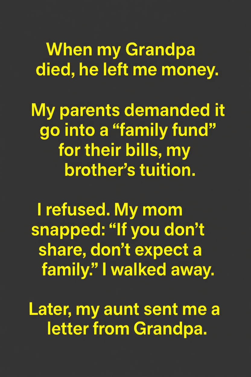 When my Grandpa passed away, he left me an inheritance. My parents insisted it should go into a “family fund” to help with household expenses and my brother’s tuition. When I hesitated, my mom grew frustrated, accusing me of being unsupportive. Feeling overwhelmed, I stepped away. Later, my aunt sent me a letter Grandpa had written for me. I couldn’t open it at first—the argument with my parents was still fresh, and I felt torn between being helpful and honoring what felt like a personal gift.
