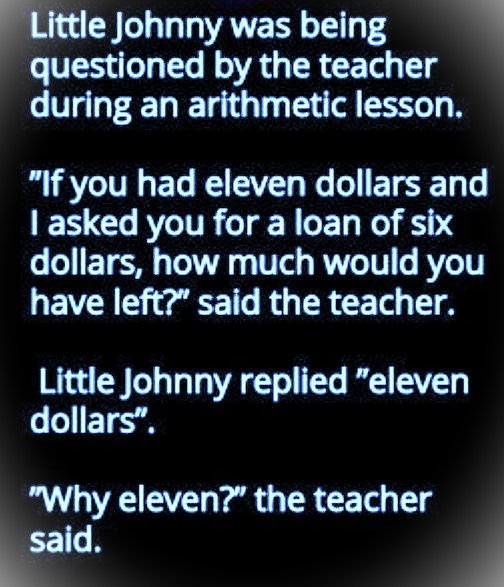 Little Johnny was being questioned during an arithmetic lesson. “If you had eleven dollars and I asked you for a loan of six, how much would you have left?” the teacher asked. Johnny confidently replied, “Eleven dollars.” The class laughed, expecting another silly Johnny moment. But he simply shrugged and said, “My dad told me never to lend money I can’t afford to lose.”