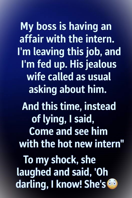 One afternoon, his wife called the office. She often checked in, her voice always sharp with suspicion. Usually, I offered polite excuses and moved on. But that day, something in me snapped. Calmly, I said, “Why don’t you come see him yourself — he’s here with the new intern.”