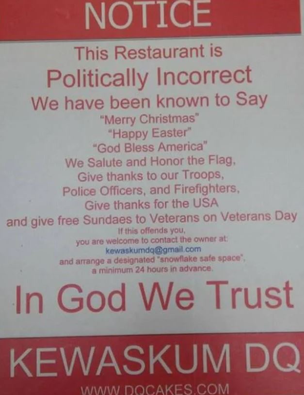 A Dairy Queen in Kewaskum, Wisconsin, drew national attention after a sign displayed in its front window went viral online. The sign described the restaurant as “politically incorrect,” explaining that staff say “Merry Christmas,” “Happy Easter,” and “God Bless America.” It also stated that the restaurant salutes the American flag, supports the troops, and offers free sundaes to military veterans on Veterans Day.