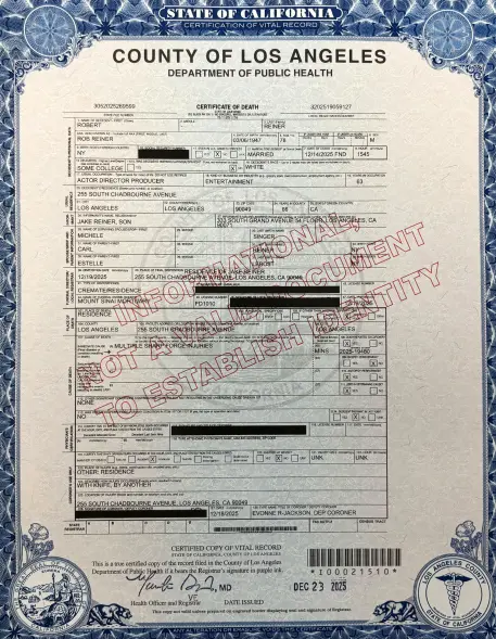 Rob Reiner and his wife, Michele Reiner, were cremated following their brutal murders, and their remains were released to their oldest son, Jake Reiner, according to death certificates issued by the Los Angeles County Medical Examiner’s Office. The certificates confirm that both died from “multiple sharp point injuries” inflicted by a knife and that the manner of death was ruled a homicide. Rob and Michele were cremated at Mount Sinai Mortuary, with their final place of disposition listed as their son’s residence.