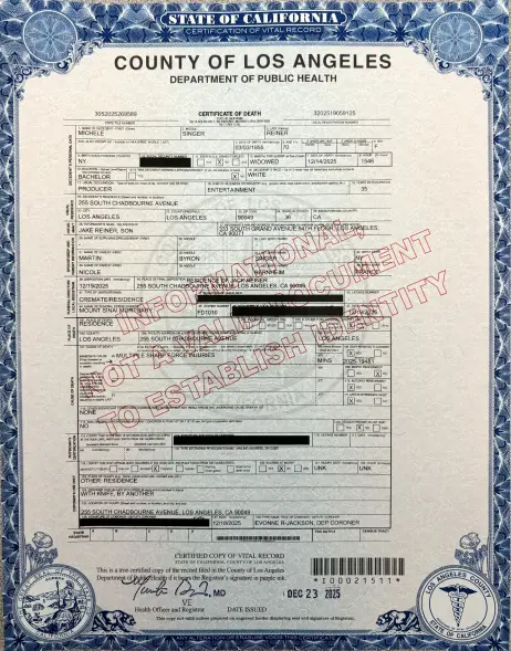 Rob’s time of death is recorded as 3:45 p.m., and Michele’s as 3:46 p.m. on December 14, shortly after first responders arrived at the family’s Brentwood home. Rob’s occupation is listed as actor, director, and producer, while Michele’s is listed as producer. Rob’s marital status is recorded as married, while Michele’s lists her as widowed, reflecting the order in which their deaths were pronounced.