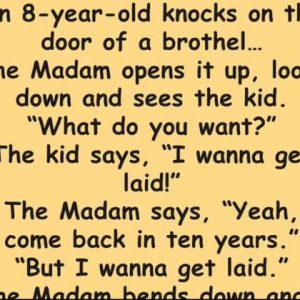An 8-year-old knocks on the door of a brothel… The Madam opens it up, looks down and sees the kid. “What do you want?” The kid says, “I wanna get laid!”