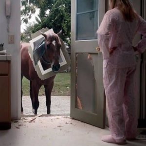 I woke to a strange sound—a dragging, scraping noise. I figured it was just the trash cans, until I walked into the kitchen and saw the bottom half of our back door destroyed… and Oscar, our horse, standing calmly on the patio, with the broken door looped around his neck.