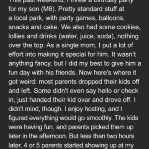 I hosted a modest birthday celebration for my six-year-old son, Asher, at a local park. There were balloons, streamers, sparkly vanilla star cookies, and a simple chocolate cake nothing extravagant, just a day filled with sunshine and happiness. Most parents dropped their kids off without much small talk, though a few gave me quick heads-ups about allergies. The food was set out buffet-style, and I assumed the children had been briefed at home. The party went off beautifully; the kids ran, laughed, and left sticky-fingered and delighted. By the evening, Asher had fallen asleep on the couch, and I began cleaning up the remnants of a joyful day.
