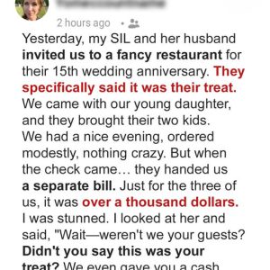 Amanda and Jeff invited us to dinner to celebrate their 15th anniversary. Amanda’s message was cheerful: “It’s our treat, honey. Just bring yourselves.” So we brought a card with $200 cash, a gesture of appreciation for the invite. The dinner was lovely — candlelight, velvet dresses, matching vests on Amanda’s kids. We kept things modest: veggie pasta, grilled chicken, mac and cheese. One shared dessert. But when the check came, Amanda gestured with flair: “We’ll take this one. And they’ll take that one,” meaning us.
