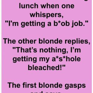Two blondes are having lunch. One whispers, “I’m getting a boob job.” The other replies, “That’s nothing, I’m getting my arsehole bleached!”First blonde gasps, “Oh wow! I didn’t know your boyfriend was getting highlights too!” A blonde asks for “extra decaf” to help her stay awake while figuring out life.