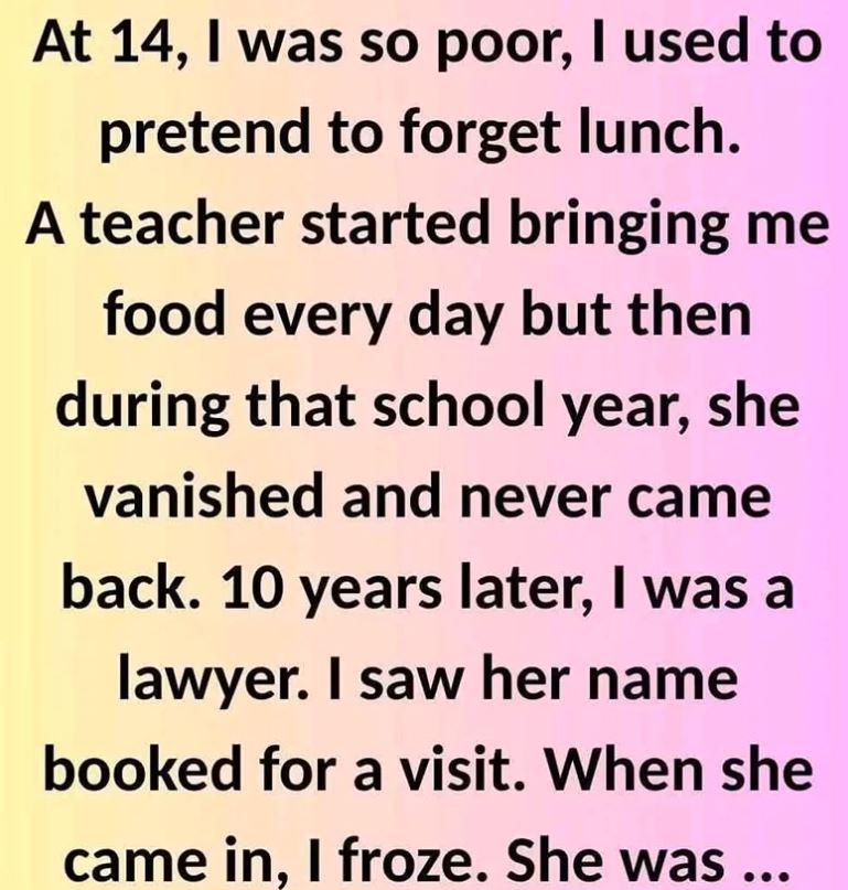 When I was just 14, life was tough. My family was so poor that I couldn’t even afford lunch at school. Every day, I’d pretend I had forgotten it—just so no one would know how bad things really were. I’d sit alone, watching others eat, hoping no one would notice the hunger in my eyes.But someone did notice.A kind teacher started bringing me food every single day. She never asked questions or made me feel ashamed. She just smiled, handed me a small lunch, and went on with her day.