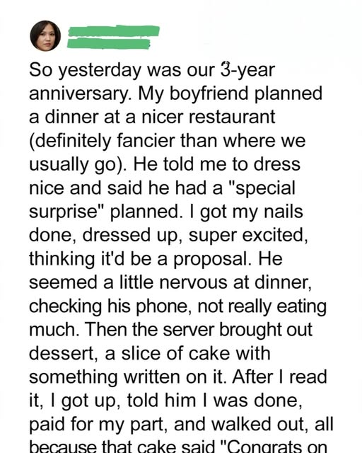 At first, everything felt perfect—until dessert arrived. Instead of a ring, the waiter placed a plate between us that read: “Congrats on Your Promotion!” in pink icing. I froze. Ryan grinned, proud of what he clearly thought was a thoughtful gesture. But I hadn’t gotten the promotion. He knew that. Worse, he knew how much it hurt. “I thought it’d be sweet to manifest it,” he said. But what he really did was mock the pain I’d trusted him with. His jokes kept coming, even when I asked him to stop. That night, I paid for my own meal and walked away.