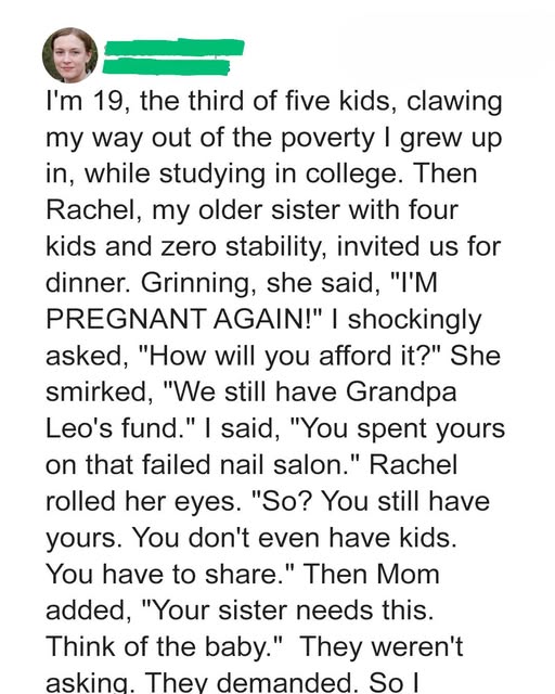 My older sister Rachel had already burned through her own share of the fund on a failed business and luxuries she couldn’t afford. At 27, pregnant with her fifth child, she made a shocking announcement during a family dinner: she wanted my portion of the college fund “for the baby.” The worst part? My mother and other siblings backed her. They saw my education as expendable compared to another of Rachel’s “emergencies.” But for the first time, I said no.