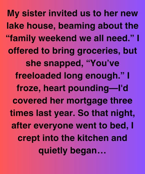 When my sister Zahra invited us to her lake house for a “much-needed family weekend,” I offered to bring groceries. Her reply? “You’ve freeloaded long enough.” My heart pounded. Last year alone, I’d paid her mortgage three times, covered emergencies, and paid for her son’s braces. That night, I made a list of every dollar I’d given her—loans she never repaid, bills I covered, favors she forgot. I wasn’t planning to confront her. I just needed proof I wasn’t crazy. The next day, a stranger with a clipboard walked the property. “She didn’t tell you?” he asked. “She’s selling the house.”