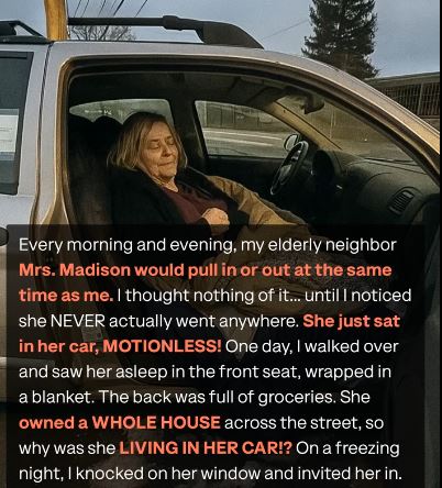 David Castle thought he knew his elderly neighbor, Mrs. Madison. She always seemed to come and go in her old Ford at the same time he did. But everything changed one freezing night when David came home late and found her sleeping in the car—wrapped in a comforter, groceries piled in the backseat.She wasn’t locked out. She was living there.