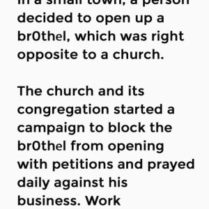 In a small town, a man opened a brothel across from a church. The church and its congregation strongly opposed it, organizing petitions and praying daily for it to fail….